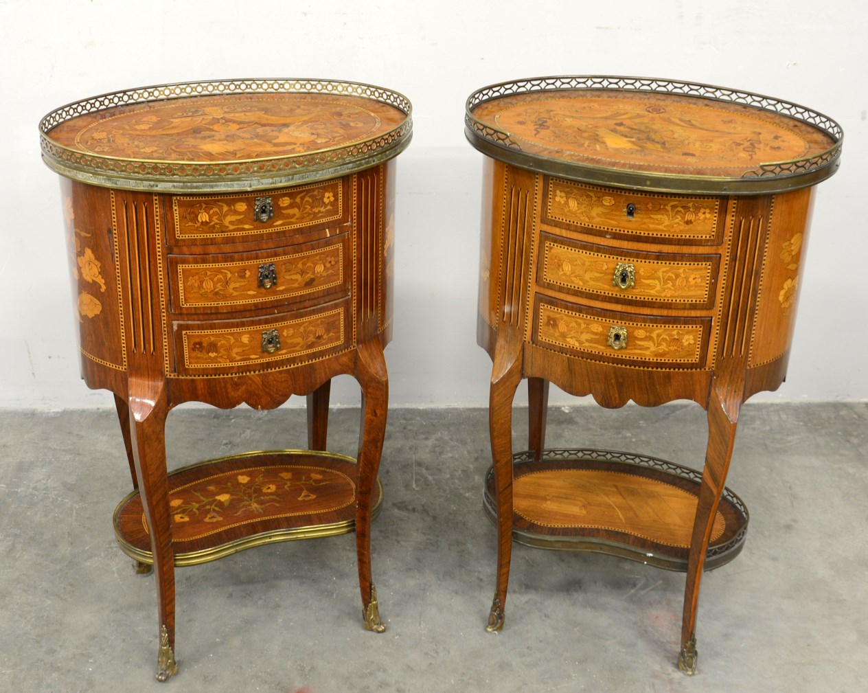 Due comodini a tamburo intarsiati e piano di raccordo, Francia, seconda met‡ sec. XIX (cm 49x81x36)