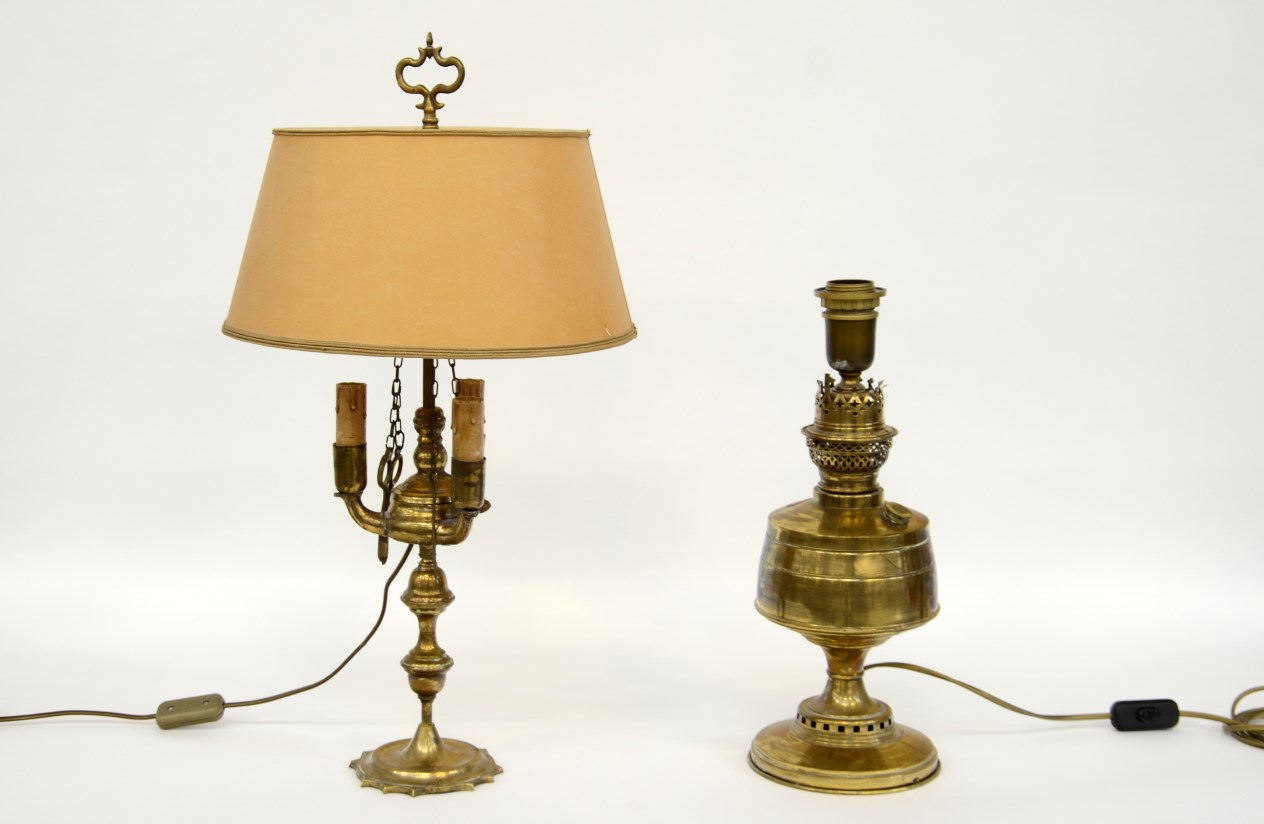 Una lucerna in ottone e una lampada ad olio in ottone marca Le Vallois-Perret...