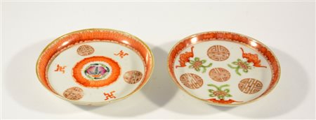Due piattini in porcellana con decorazione rosso ferro con pipistrelli, marchio apocrifo sul fondo, Cina (diam 13,5 cm)