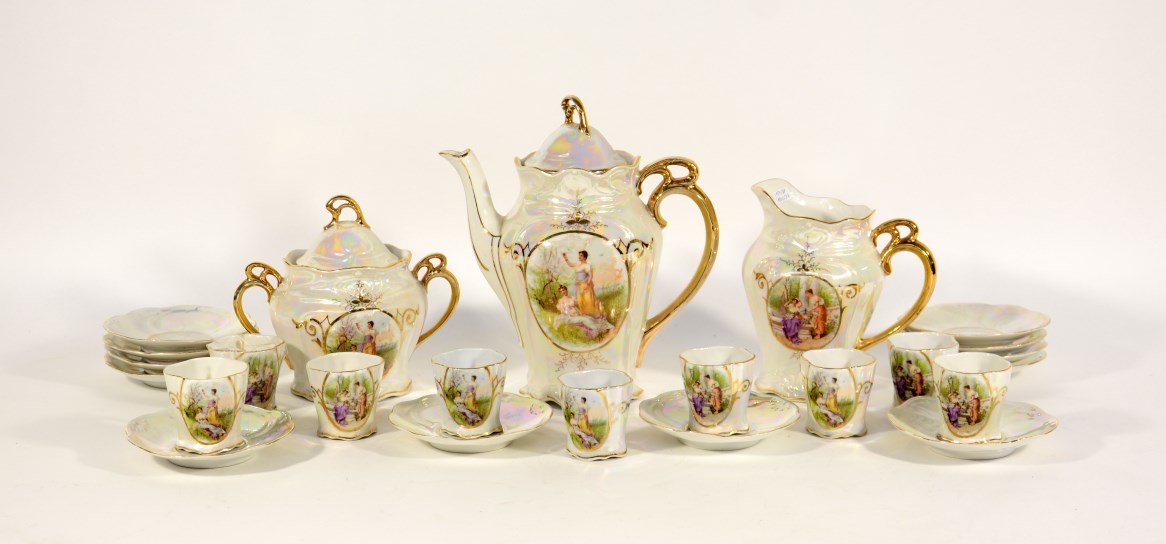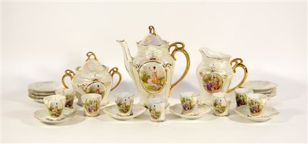 Parte di servizio da caffË in porcellana a lustrondi gusto Liberty con figure...