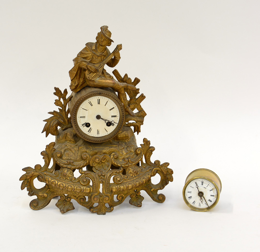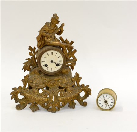 Lotto composto da un orologio da tavolo in metallo dorato e una sveglia da viaggio