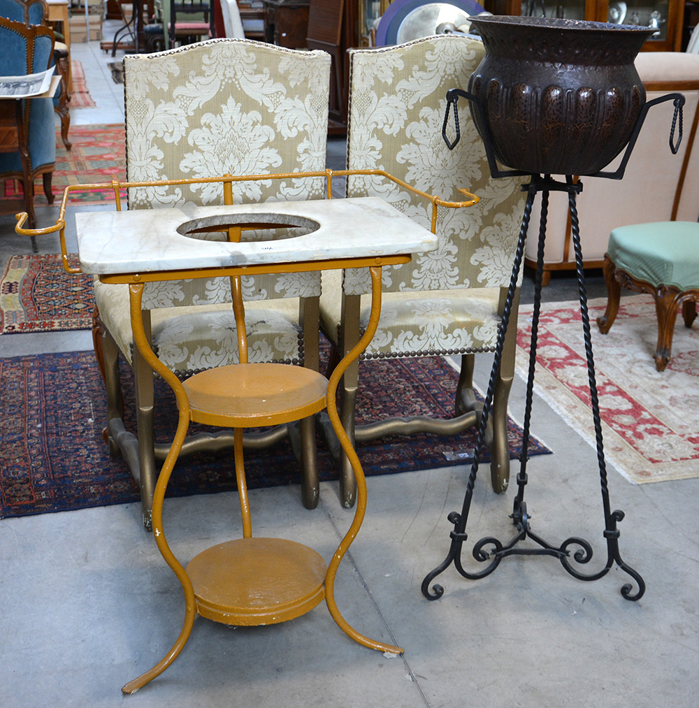 Lotto composto da una toilette in ferro battuto con pianetto in marmo e un vaso portafiori in ferro e rame (difetti)