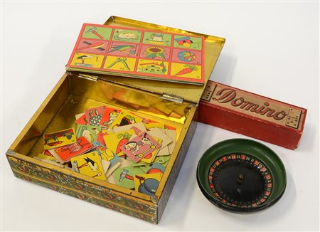 Scatola in lacca contenente alcuni vecchi giochi (difetti)