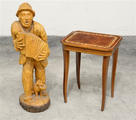 Lotto composto da un tavolino e una scultura in legno raffigurante un suonatore (difetti)