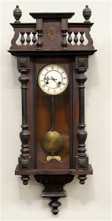 Pendola a muro con cassa in legno di forma architettonica, quadrante in smalto con cifre romane, movimento con carica settimanale, suoneria su gong. Probabile produzione tedesca