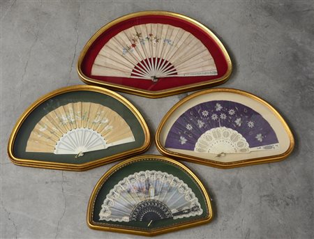 Lotto composto da quattro ventagli di fatture diverse, in teca (difetti)