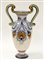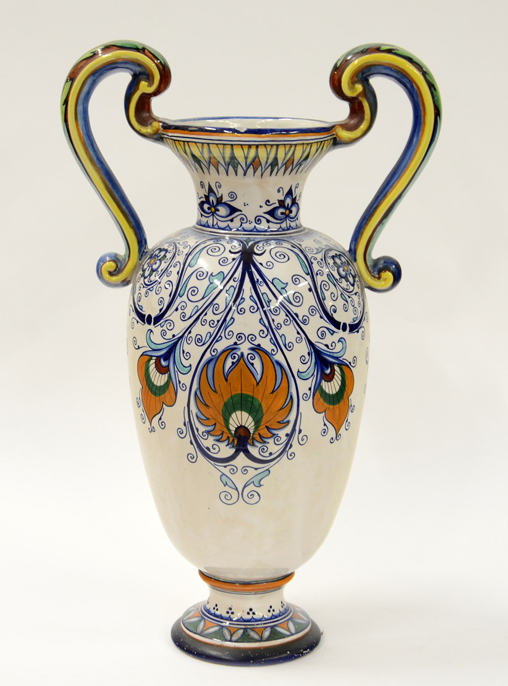 Manifattura di Faenza. Lotto composto da due vasi biansati in ceramica decorati in policromia a volute (difetti)