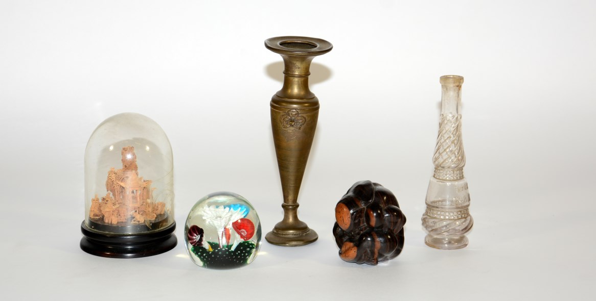 Lotto composto un presse papier, un gruppo in sughero e tre oggetti diversi (difetti)