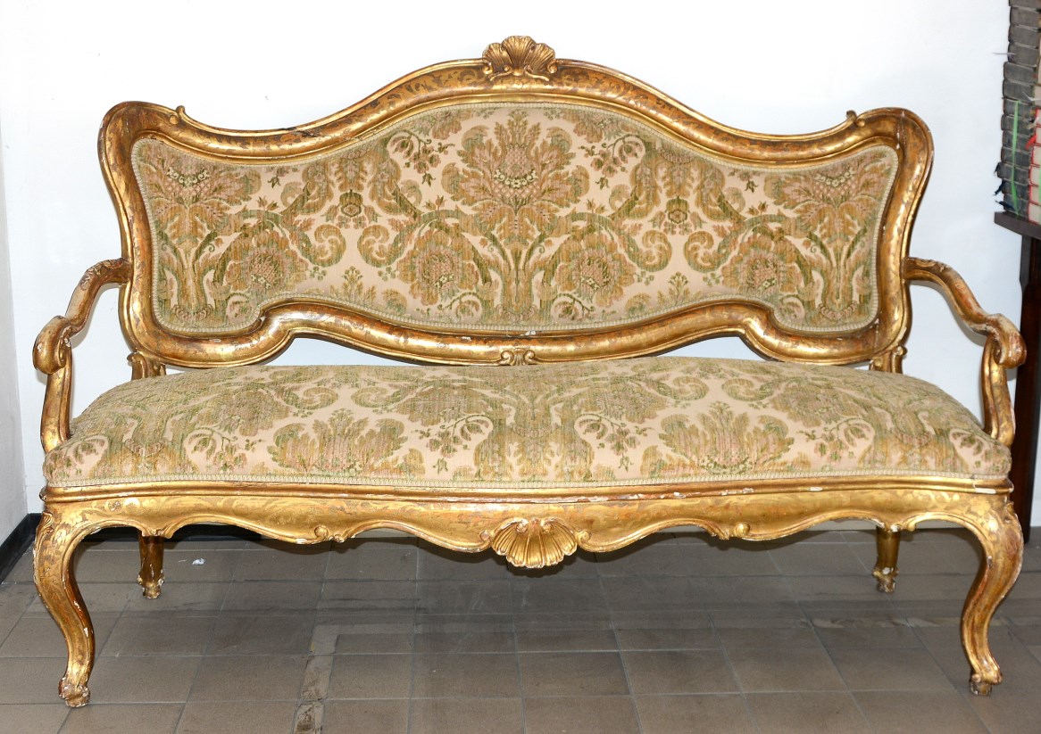 Divano a tre posti in stile Luigi Filippo in legno intagliato e dorato, seduta e dorsale rivestiti in tessuto operato (difetti)