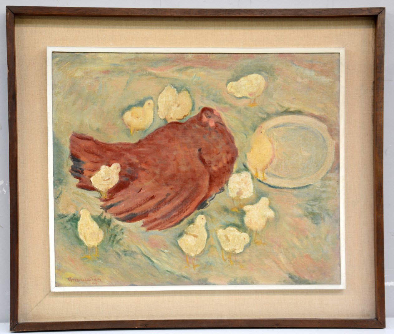 Montanari Giuseppe Osimo (1889- Varese 1976) "Chioccia", olio su cartone telato (cm 48x58) firmato e datato '44 in basso a sinistra.
