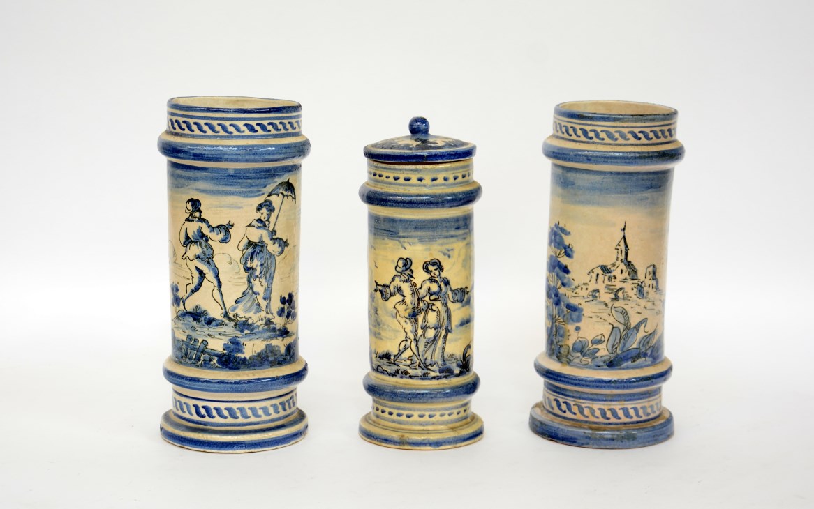 Manifatture diverse, lotto composto da tre vasi, di cui uno con coperchio, in ceramica, decorati nei toni del blu (difetti)