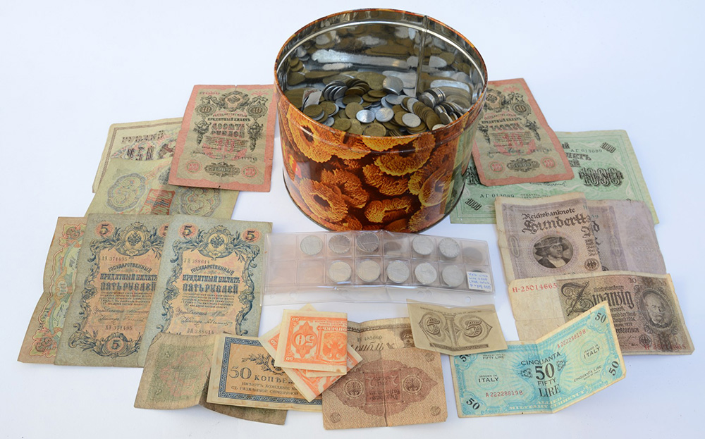 Scatola contente numerose monete e cartamoneta di diversa epoca