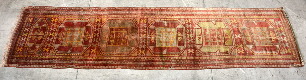 Passatoia Yomut Anatolia fine sec. XIX. Disegno a grandi gul nei toni del rosso, azzurro, verde su fondo rosso (cm 383x103)(difetti)