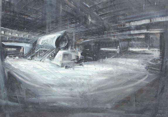 Alessandro PAPETTI Milano 1958 Interno di fabbrica, 1990 olio su tela oil on canvas cm 70×100 Opera soggetta a IVA al 21% The work is subject to VAT 21% Firma, data ‘A. Papetti, 90’ (in basso a destra) Signed, dated ‘A. Papetti, 90’ (lower right)