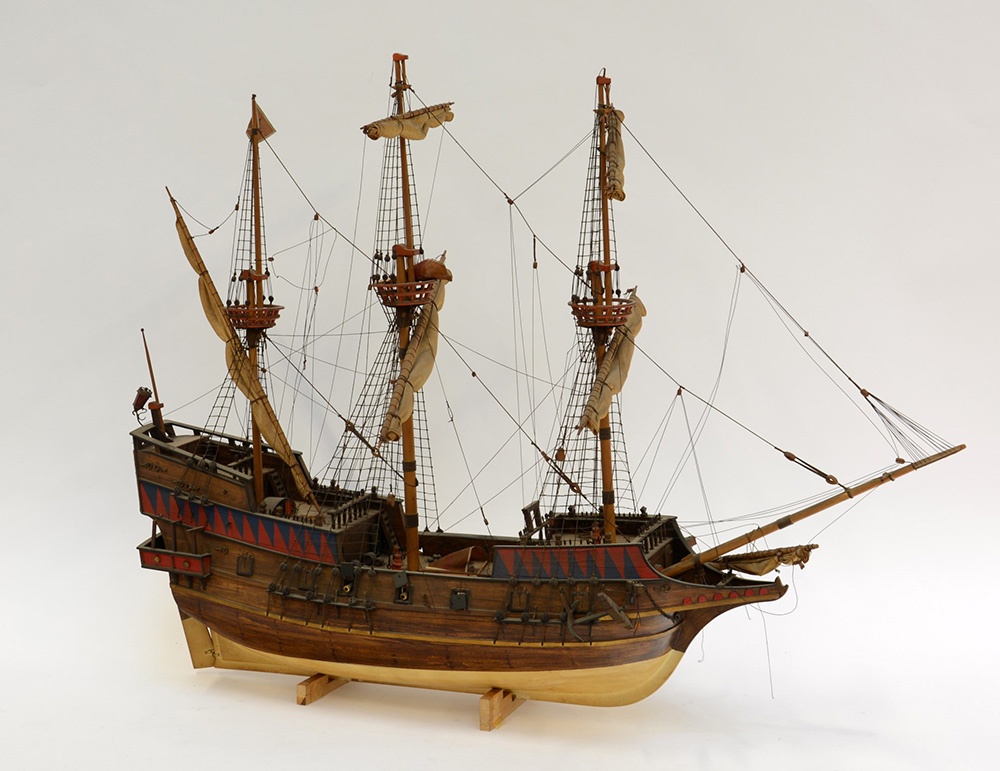 Modello di veliero a tre alberi in legno con finiture in metallo (difetti)