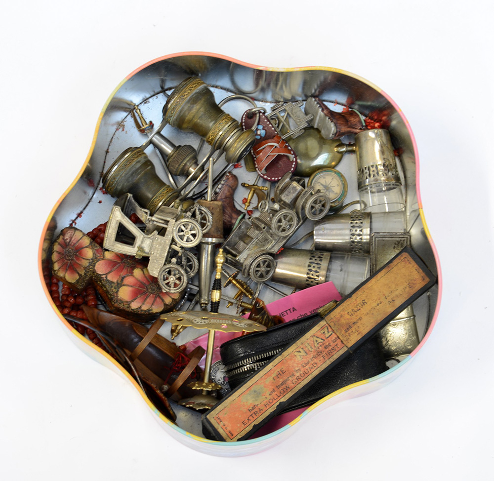 Scatola in latta contenente numerosi oggetti diversi (difetti)