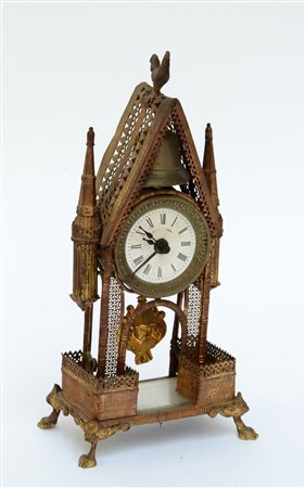 Pendola da tavolo in metallo dorato di forma architettonica, quadrante a...