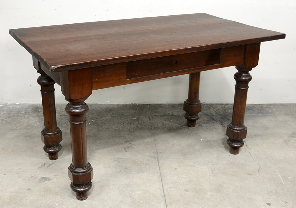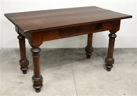 Tavolo di forma rettangolare ad un cassetto nella fascia con gambe tornite scanalate (cm 140x80x78) (difetti)