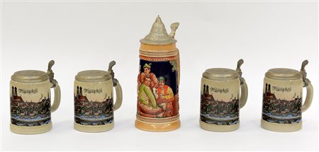 Lotto composto da cinque boccali da birra in ceramica (difetti)