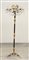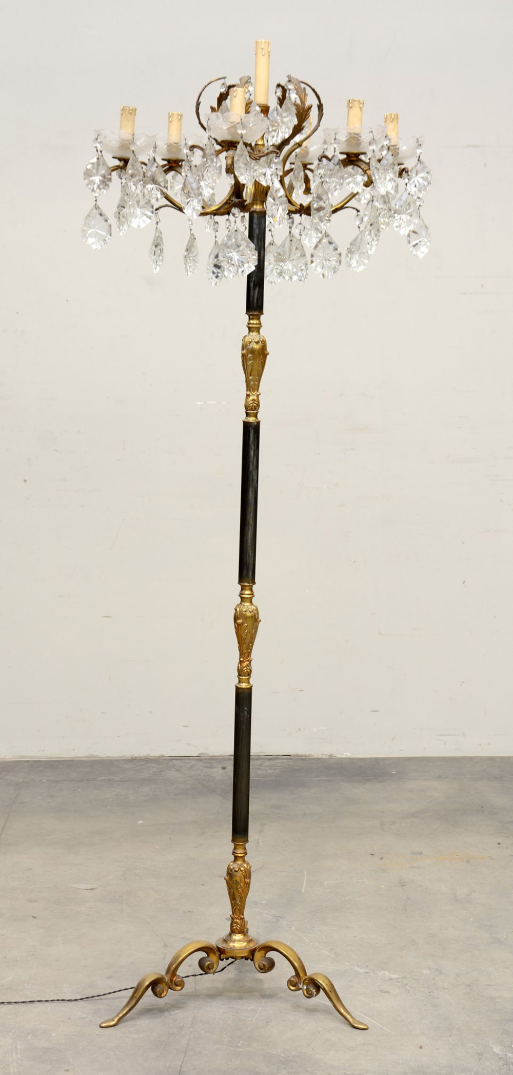 Candeliere a sei braccia in metallo dorato decorato a motivi floreali e pendenti in vetro (cm 156) (difetti)