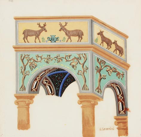 Gino SEVERINI Cortona 1883 - Parigi 1966 Senza titolo, 1926 gouache su carta gouache on paper cm 22×23 Autentica di Romana Severini su fotografia, in data 27/11/2008 Certificate of Romana Severini dated 27/11/2008 Firma ‘G.Severini’ (in basso a destra) Dedica (al retro) Signed ‘G. Severini’ (lower right) Dedication (on the reverse)