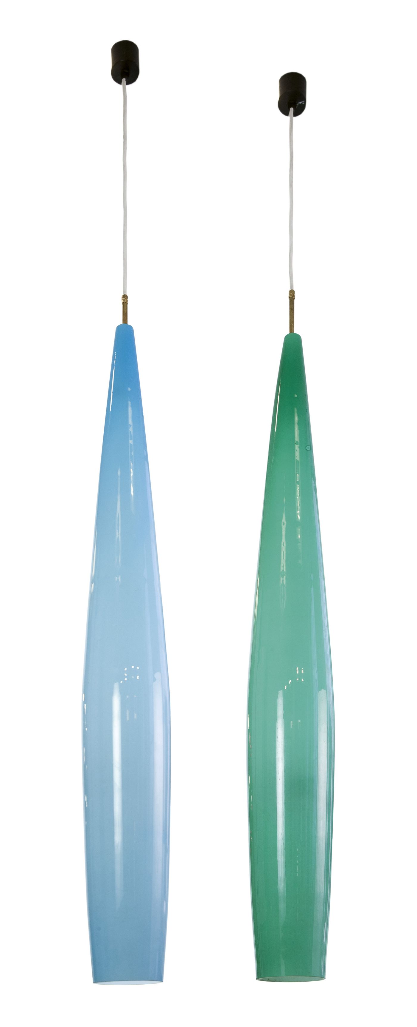 PIANON ALESSANDRO - Coppia di grandi lampadari. Vetro soffiato colorato e incamiciato opalino. Prod. Vistosi, Murano 1959. H cm. 100. Bibl.: Antonio Caprotti, "Quasi cento lampadari da salvare" , Antonio e Angelo Caprotti editori, senza data.