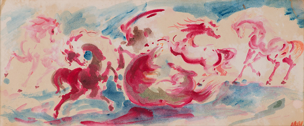 ALIGI SASSU (1912-2000) Danze di cavalli Acquerello su carta cm 15x34,7 Firma...