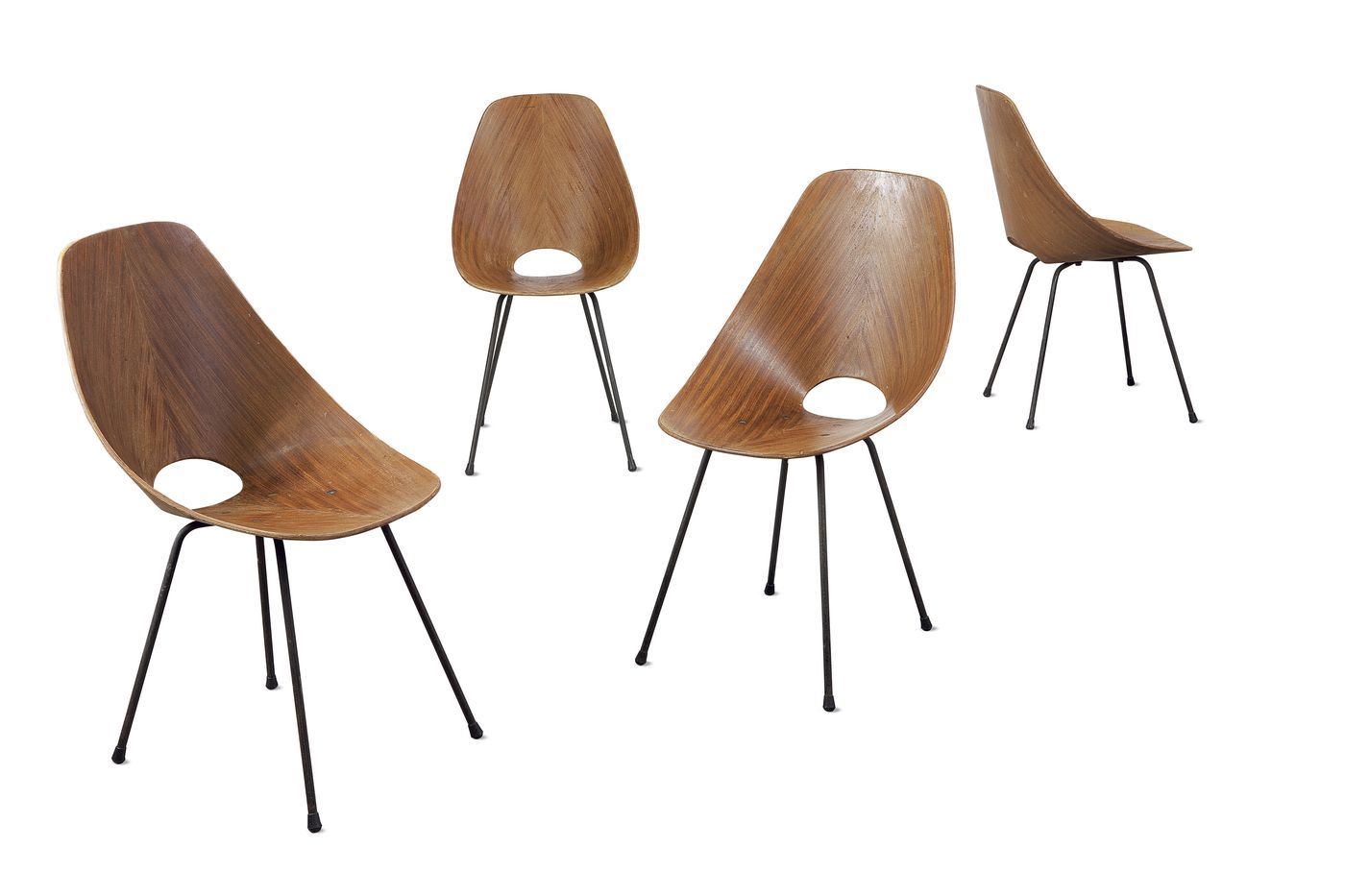 NOBILI VITTORIO - Quattro sedie Medea. Compensato curvato, struttura in metallo laccato. Segnalazione compasso d’oro 1956. Prod. Tagliabue 1955. Bibl.: Giuliana Gramigna, "Repertorio 1950-1980", Mondadori, 1985, pag. 90