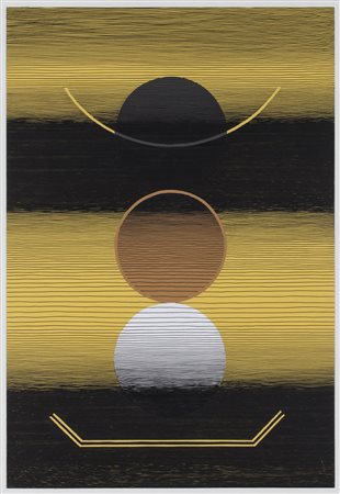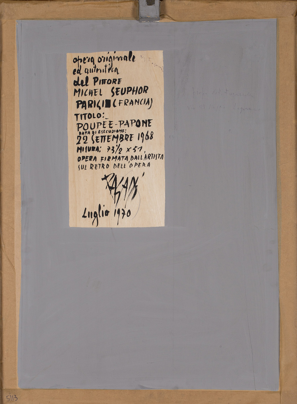 Dichiarazione d'autenticità e provenienza a cura di Enzo Pagani con titolo, data di esecuzione (22 Settembre 1968) e misure al retro della tavola protettiva in data Luglio 1970