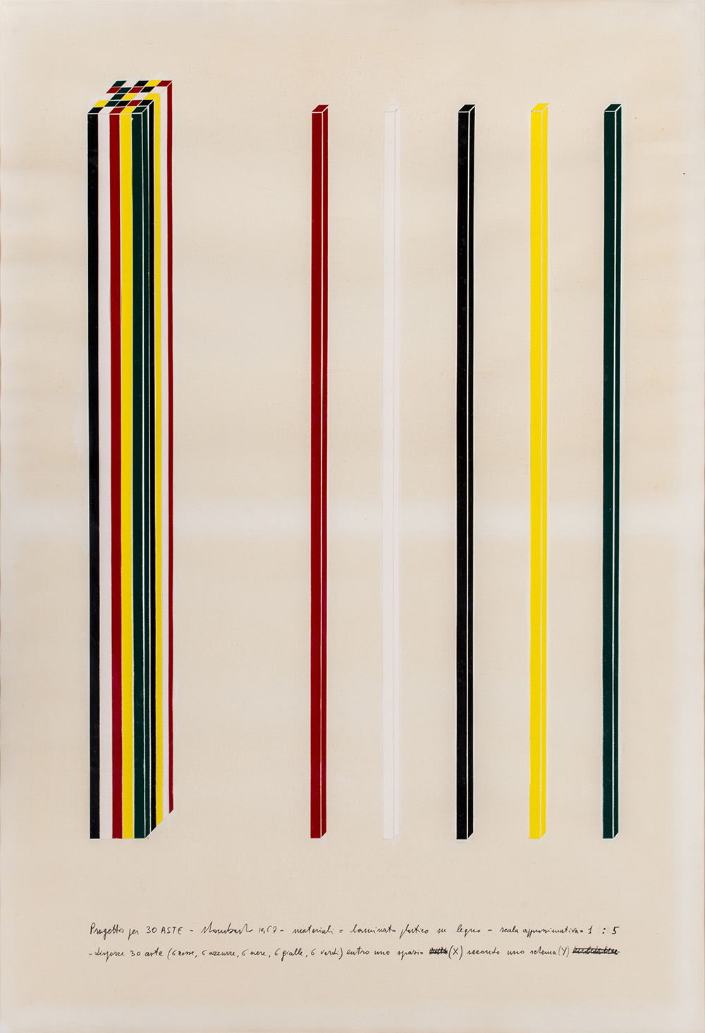 Firma, titolo, datazione ed iscrizione "Progetto per 30 Aste - November 1967 - materiali = laminato plastico su legno - scala approssimativa = 1 : 5 - disporre 30 aste (6 rosse, 6 azzurre, 6 nere, 6 gialle, 6 verdi) entro uno spazio (X) secondo uno schema (Y)" al fronte