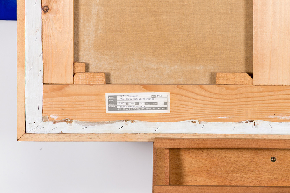 Etichetta della Galleria d'Arte Schwarz (MI) con relativo numero di inventario al retro