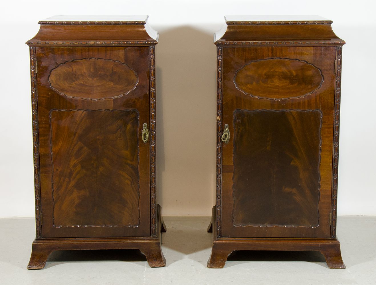 Coppia di alti comodini in legno con grande anta, bordi scolpiti. Inizio XX secolo. H. cm. 105.
