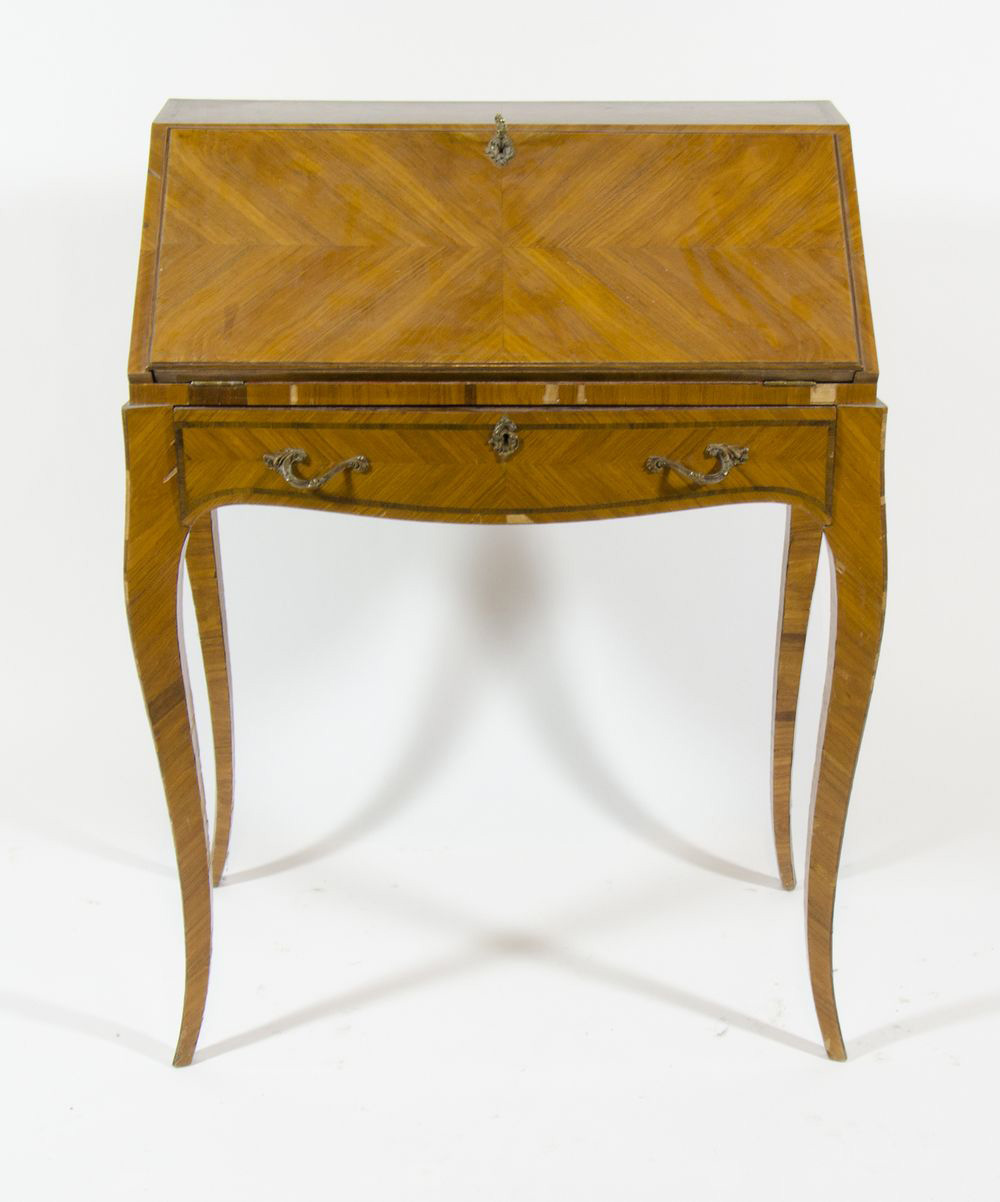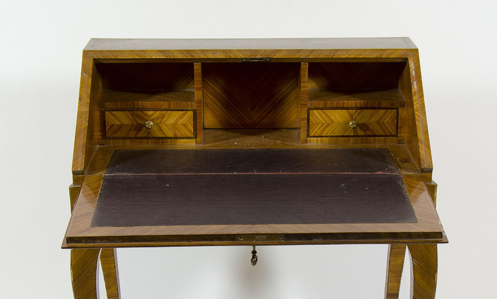 Piccolo scrittoio in legno con cassetto e calatoia, su alte gambe mosse.