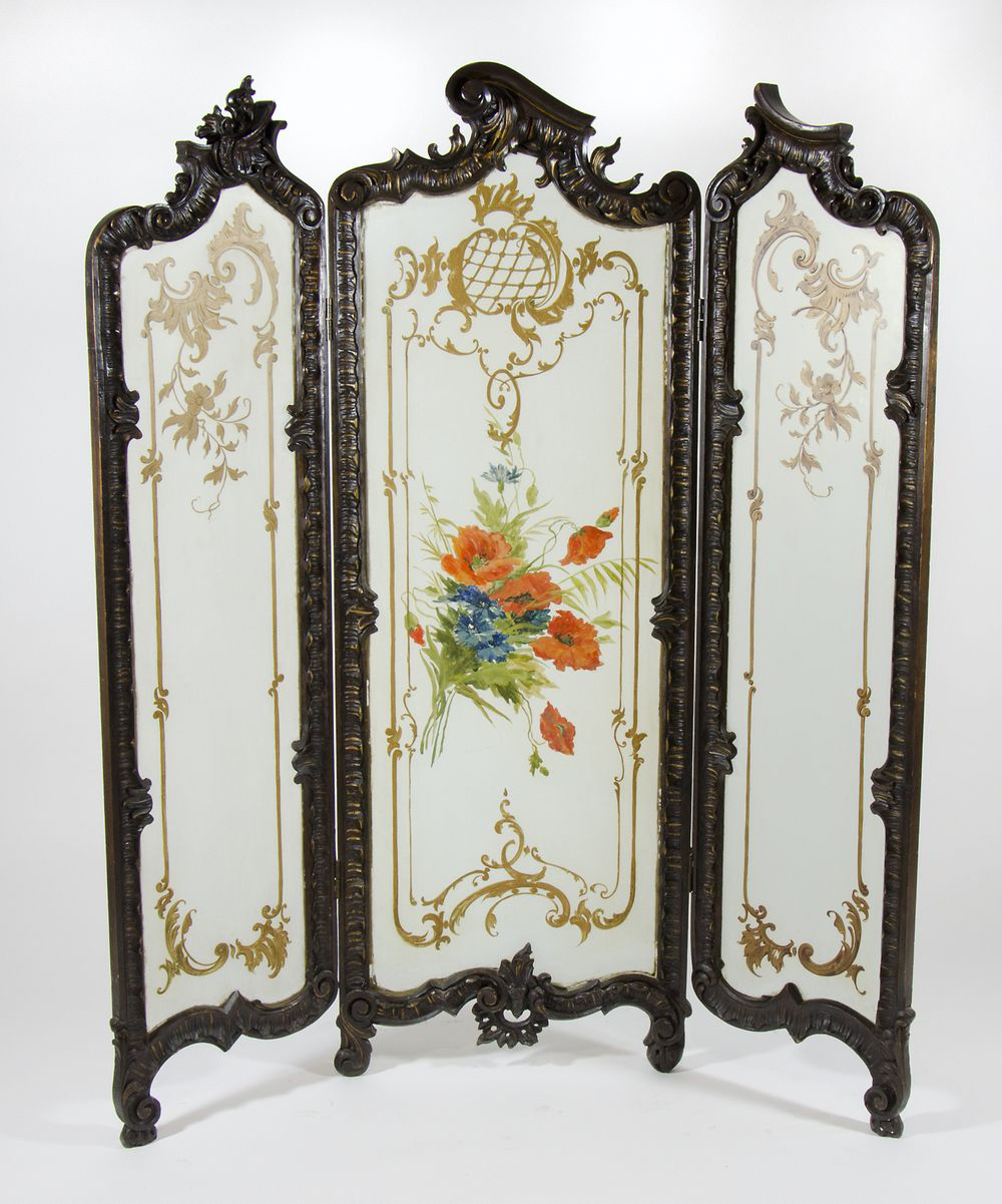 Paravento in legno scolpito a 3 ante a vetri dipinti a motivi floreali. Fine...