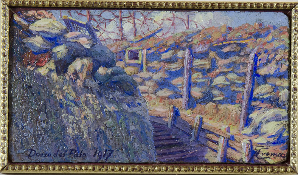 Giovan Battista Crema 1883-1964 "Dosso del Palo" cm. 8x14 - olio su cartone Firmato b. a d. e datato 1917. Titolo b. a s.