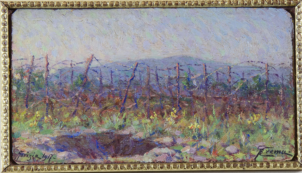 Giovan Battista Crema 1883-1964 "Campagna goriziana" cm. 8x14 - olio su cartone Firmato b. a d. e datato 1917.