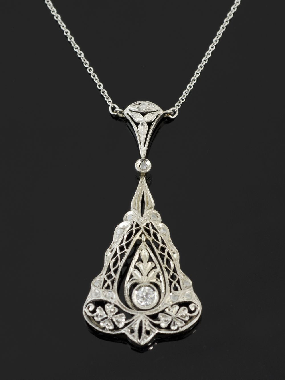 Lotto 93 | Pendente in oro bianco traforato con diamante centrale di ct 0,15, anni '30
