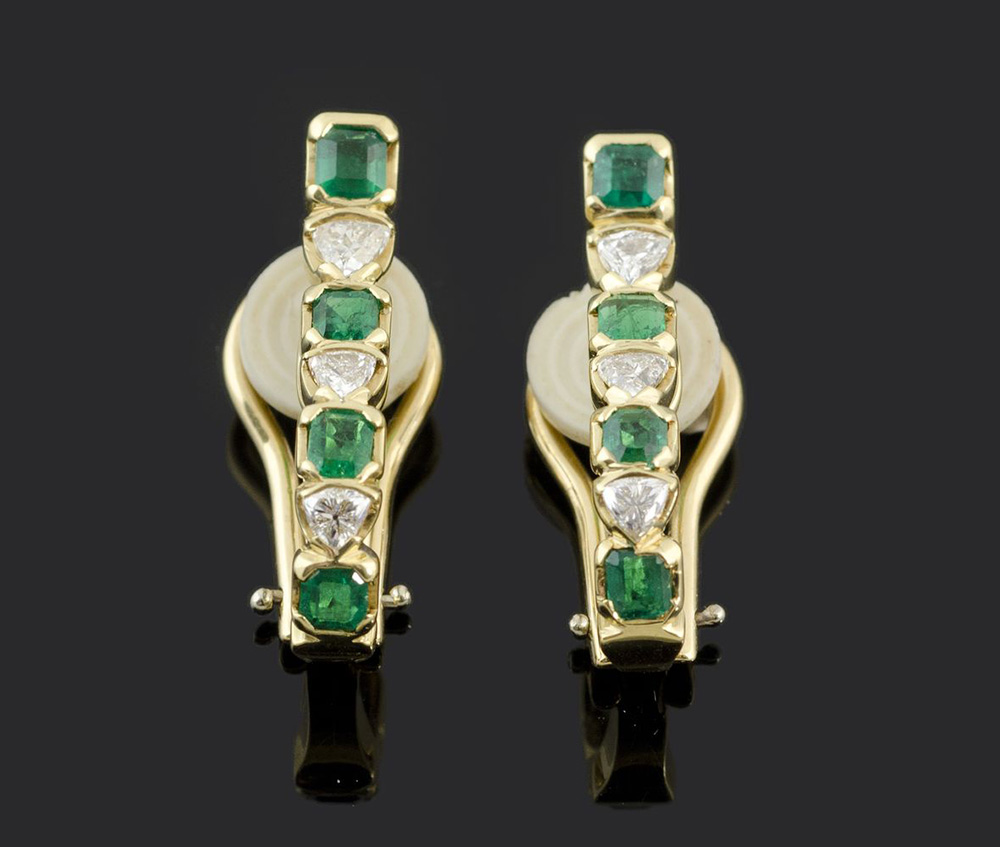 Paio di orecchini in oro giallo con diamanti taglio triangolare di ca ct 0,30 alternati da smeraldi di ct 0,60
