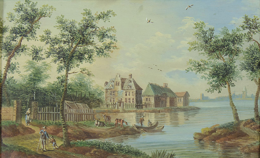 Maestro nordico del XVIII secolo "Paesaggio con figure" cm. 14x22 - olio su tavoletta
