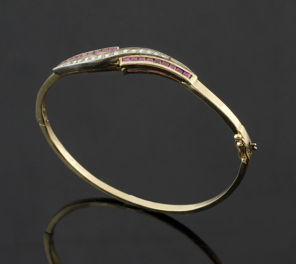 Bracciale rigido in oro giallo con piccoli rubini e diamantini, gr 11,6