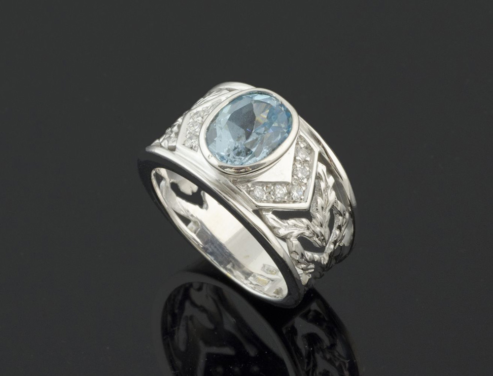 Anello in oro bianco a fascia traforata con topazio azzurro ovale centrale e decori con brillantini