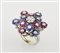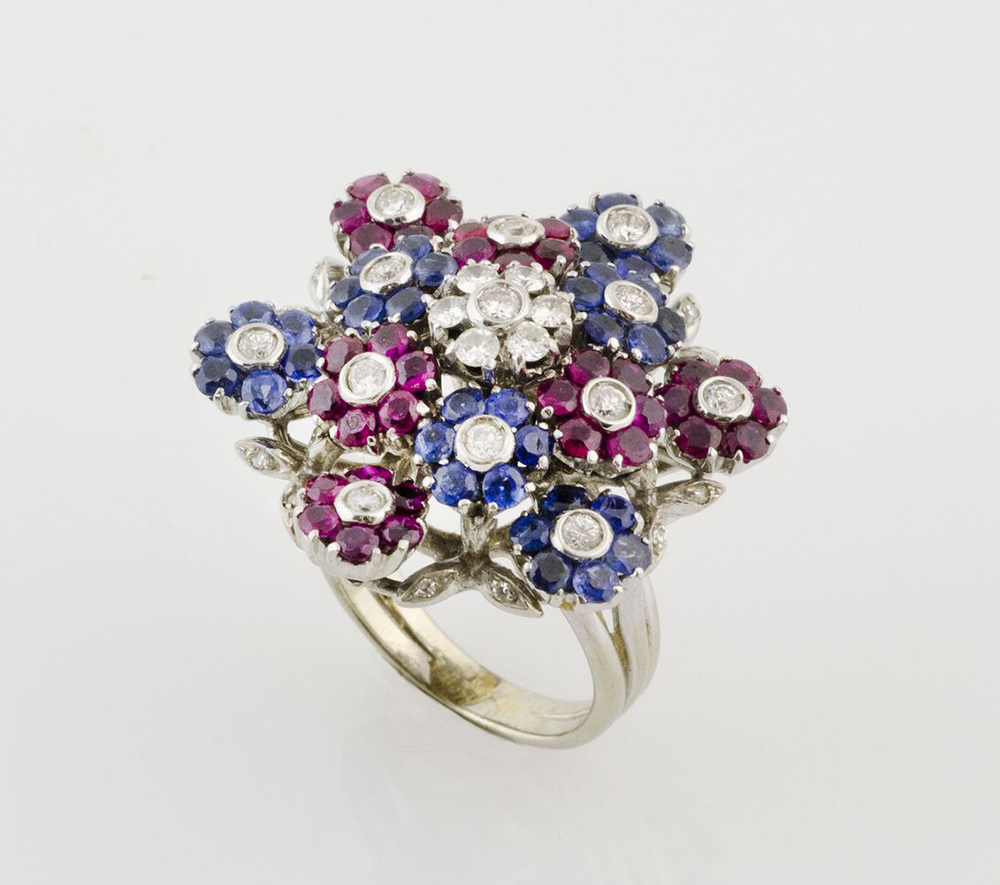 Grande anello in oro bianco a forma di fiore con diamantini, rubini e zaffiri.
