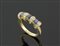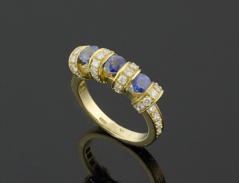 Anello in oro giallo con passantini ornati di brillanti intercalati da zaffiri blu