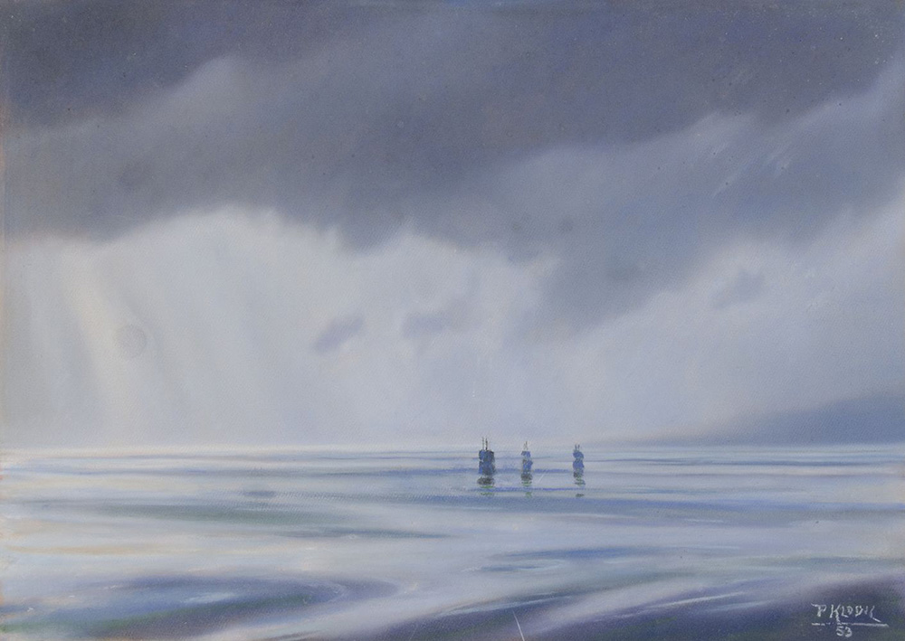 Paolo Klodic Trieste 1887-1961 "Boe al largo" cm. 50x70 - pastelli colorati Firmato b. a d. e datato '53.