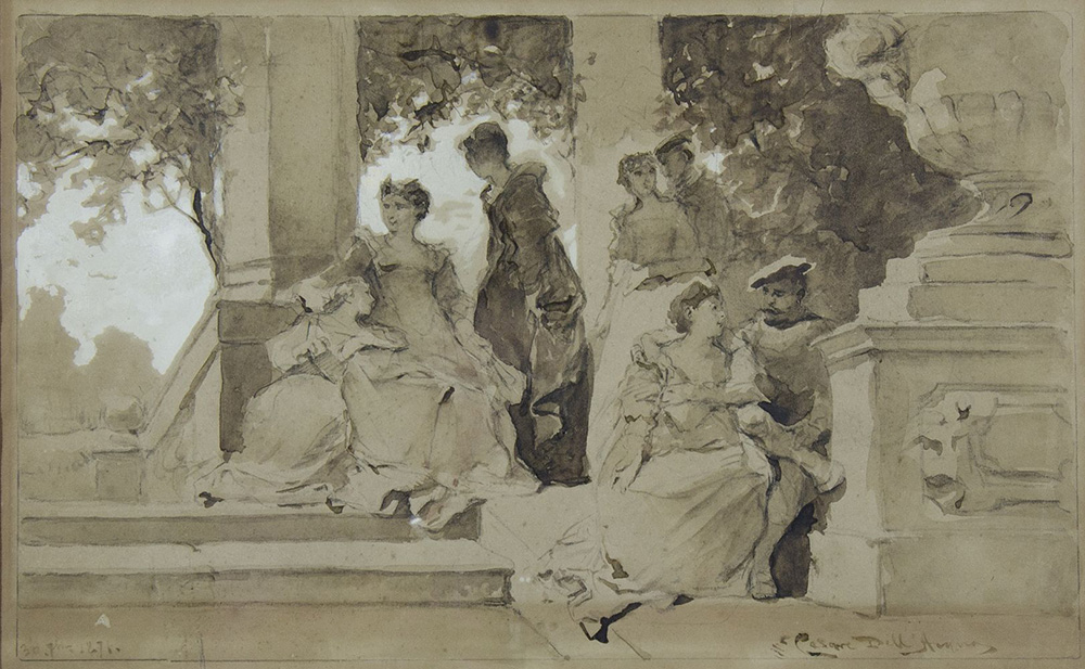 Cesare Dell’Acqua Pirano 1821-Bruxelles 1905 "Scena galante" cm. 27x44 - acquerello su carta Firmato b. a d. e datato 1876.
