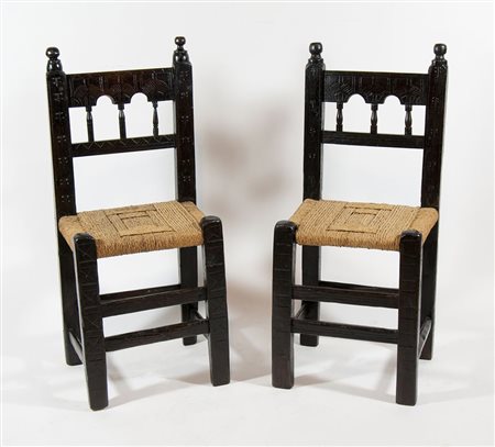 Lotto di 4 sedie spagnole scolpite con sedute impagliate.
