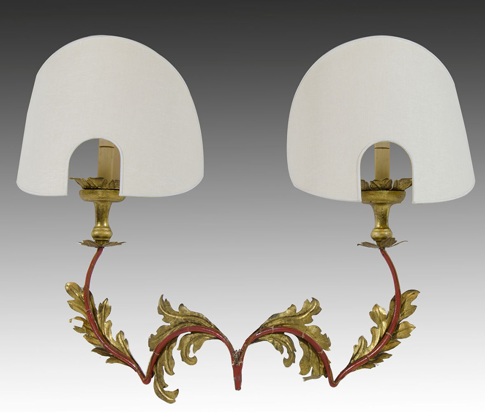 Lotto 201 | Coppia di grandi appliques in metallo dipinto e dorato a due luci, decorate a...