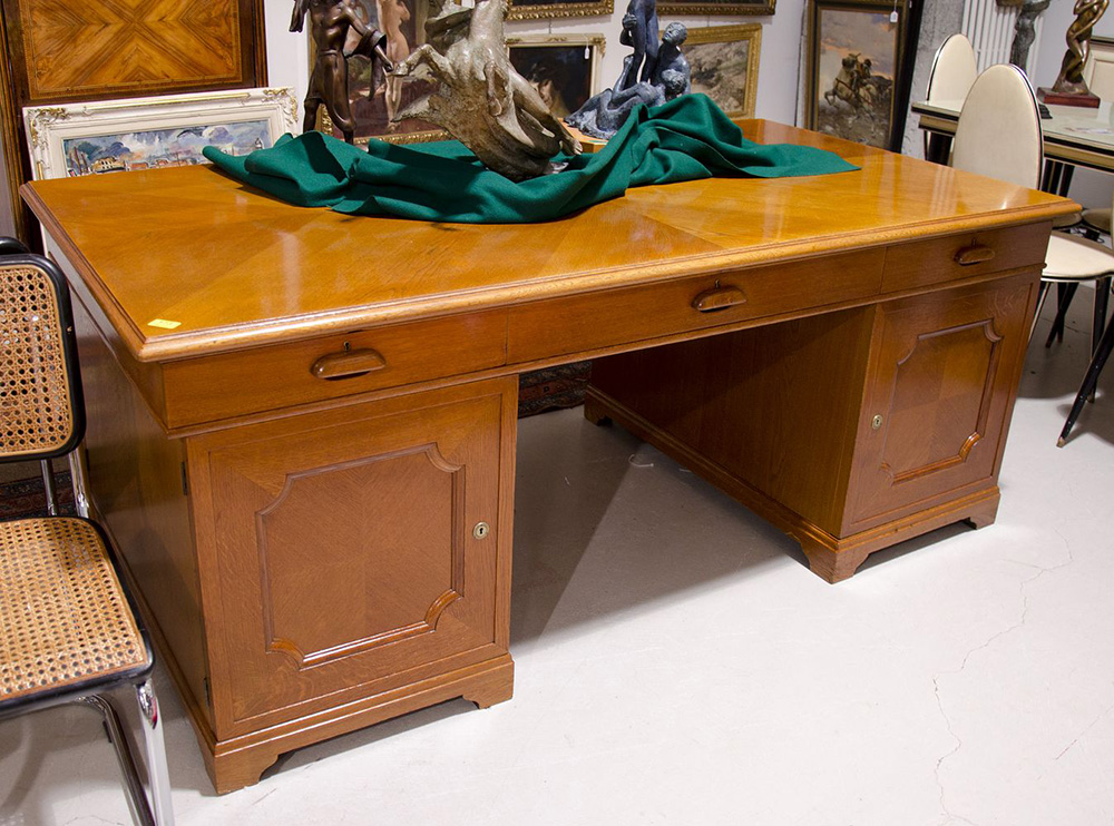 Grande scrivania a 3 cassetti e 2 ante laterali. XX secolo. cm. 78x190x105.