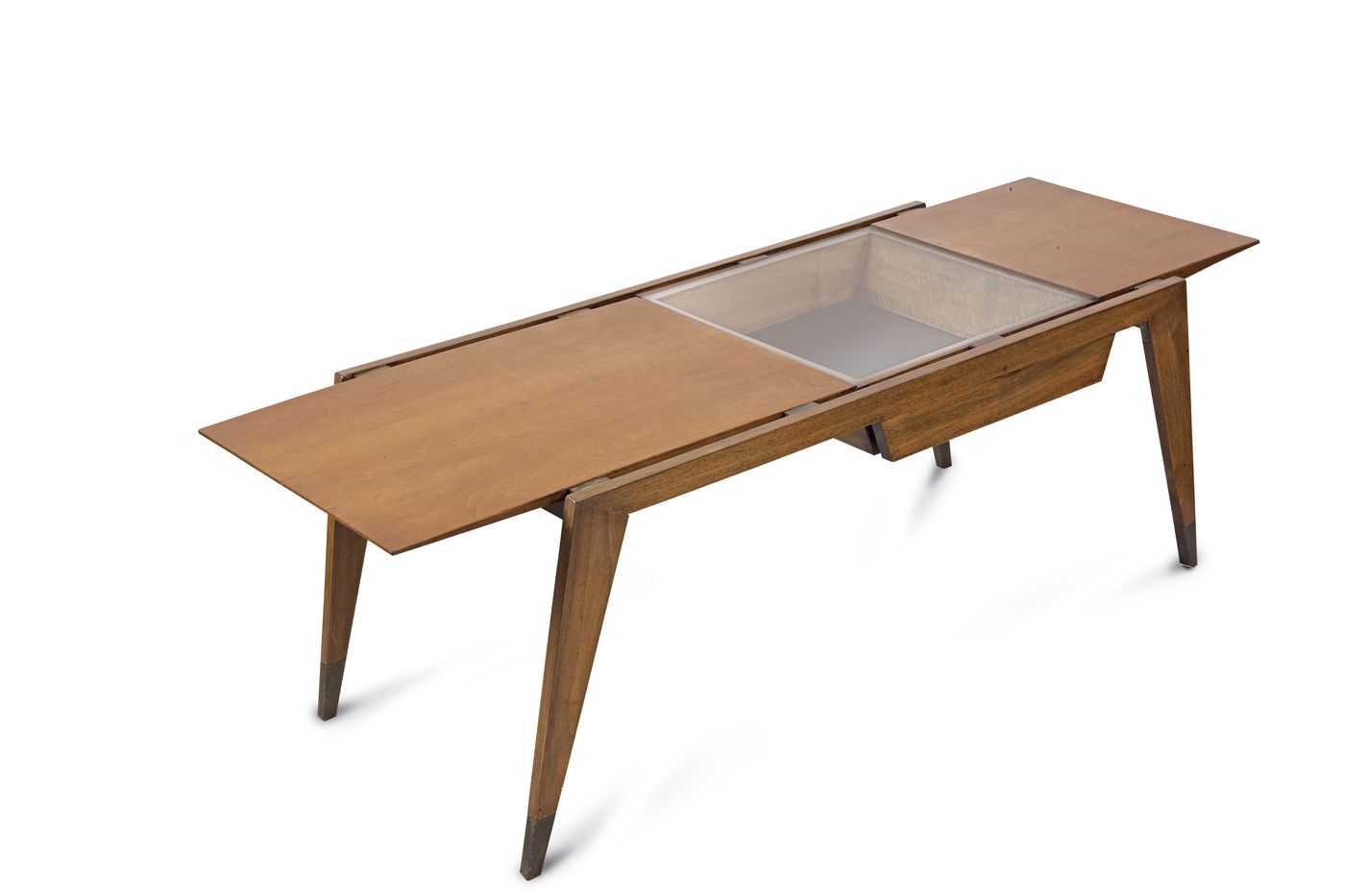 TAVOLINO - Tavolino in noce. Piani fortemente rastremati, distanziali e puntali in ottone, vano a giorno con coperchio in cristallo, nello stile di Gio Ponti. 1950 circa. lungh. col vetro cm. 140