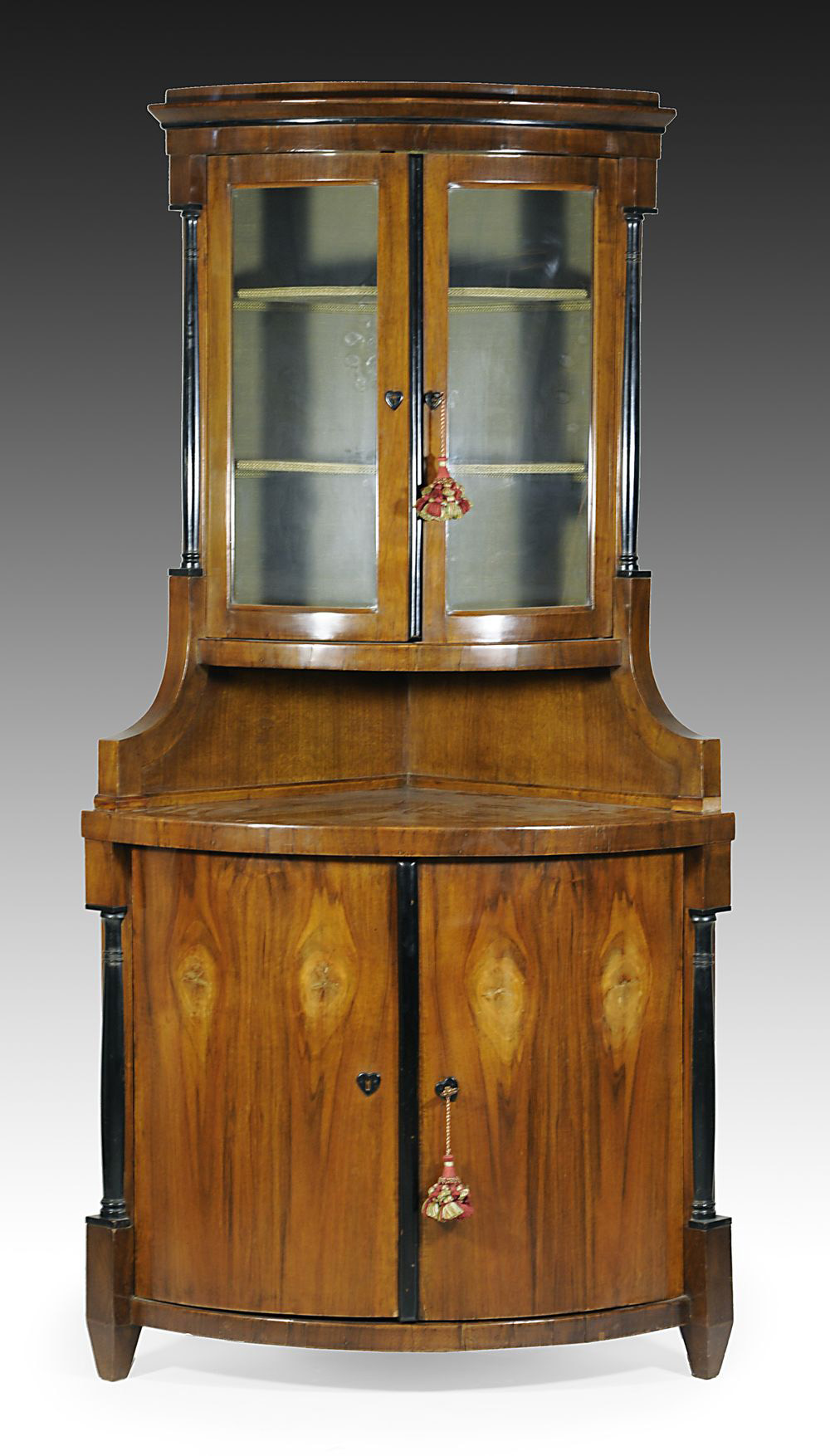 Angoliera in legno a due corpi, parte inferiore a due ante e parte superiore a due ante a giorno. XIX secolo.